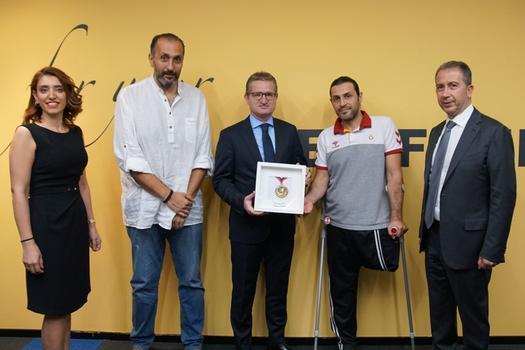 Galatasaray Tekerlekli Sandalye Basketbol Takımı Başantrenörü Sedat İncesu ve oyuncularımızdan Bülent Yılmaz Türk Nippon Sigorta’ya ziyarette bulundu. 1905 GSYİAD Başkanı Metin Öztürk’ün de katıldığı ziyarette Türk Nippon Sigorta Genel Müdürü Dr. E. Baturalp Pamukçu’ya teşekkür madalyası takdim edildi. Ziyaret ile alakalı konuşan Türk Nippon Sigorta Genel Müdürü Dr. E. Baturalp Pamukçu ‘’Geçen sene başlayan iş birliğimiz başarılı şekilde sonuçlandı. Tekerlekli sandalye basketbol branşı Galatasaray Spor Kulübü’nün en başarılı branşlarından bir tanesi. Bu sene Avrupa’nın en büyük ikinci kupasını kazandı. Ümidimiz aynı başarıları seneye de göstermesi. Oyuncularımız ve Başantrenör Sedat İncesu’ya teşekkür ederim. Bu işbirliği umarım seneye de devam edecek şeklinde konuştu. Başantrenör Sedat İncesu ise ‘’Sponsorumuza bir teşekkür ziyaretinde bulunup başarıyı paylaşmak istedik. Kendilerine çok teşekkür ederim. İnşallah birlikte daha başarılı ve hoş sezonlar geçireceğiz’’ ifadelerini kullandı.